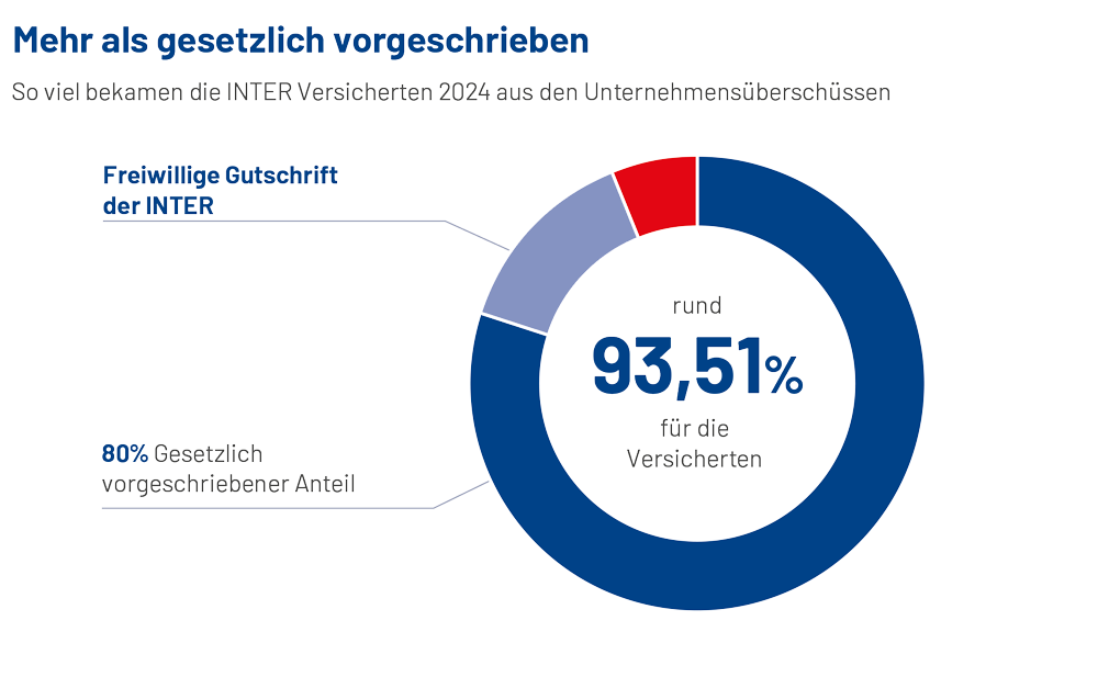 Die INTER legt großen Wert darauf, ihre Kunden finanziell zu entlasten. Während private Krankenversicherer gesetzlich verpflichtet sind, mindestens 80% ihrer Unternehmensüberschüsse an die Versicherten zurückzugeben, geht die INTER noch weiter: Im Jahr 2024 gibt sie 93,51% ihrer Überschüsse an ihre Kunden weiter. Diese Rückgabe erfolgt in Form von: