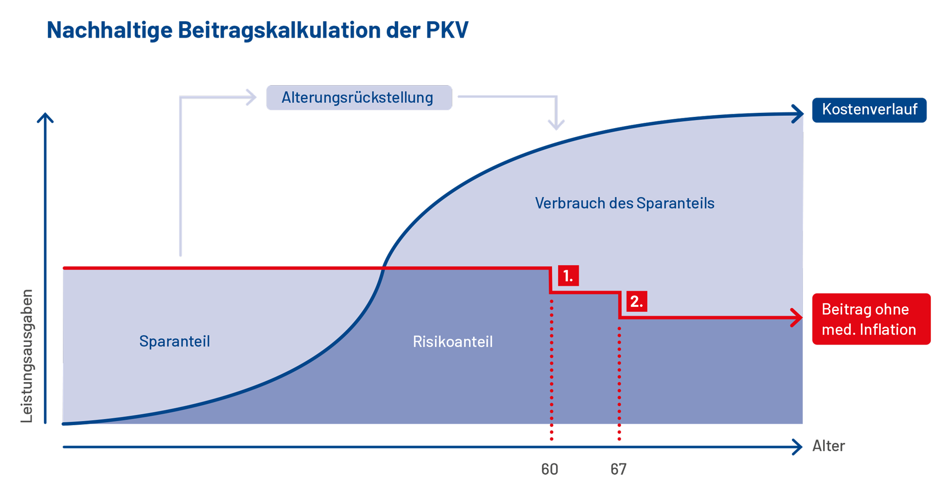 Die Kalkulation des persönlichen Beitrags erfolgt unter Berücksichtigung langfristiger statistischer Daten über die Lebenserwartung und die typischen Gesundheitskosten. Dabei muss die Summe der eingezahlten Beiträge aller Versicherten eines Tarifs im gesamten Versicherungsverlauf der Summe der Leistungsausgaben entsprechen.